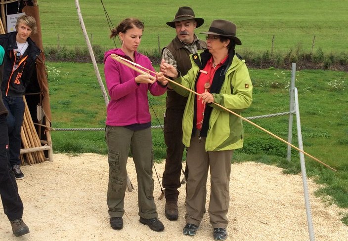 Neben Mammuts waren Rentiere und Wildpferde eine wichtige Nahrungsbasis unserer vorschwäbischen Urahnen. Deren Höhlenunterkünfte stehen im Archäopark Vogelherd in Niederstotzingen (LK Heidenheim) unter Schutz. Dort trafen sich am 13.9.2014 naturpädagogisch interessierte Jägerinnen und Jäger zur Lernort Natur Fortbildung des LJV. Neben Hintergrundinformationen zur Lebensweise der Steinzeitmenschen erhielten die Lernort Natur-Aktiven Übung an verschiedenen Stationen zum Mitmachen, z.B. Feuer machen, in die Kleidung der Steinzeitjäger schlüpfen und Kleber der Steinzeit. Mit Spurensuche des damaligen Wildes und Speerschleudern wurde die Wildpferdjagd nachgestellt. Zum Mittagessen wurde die Feuerstelle genutzt um Rosswürste oder Pferdesteaks zu grillen.